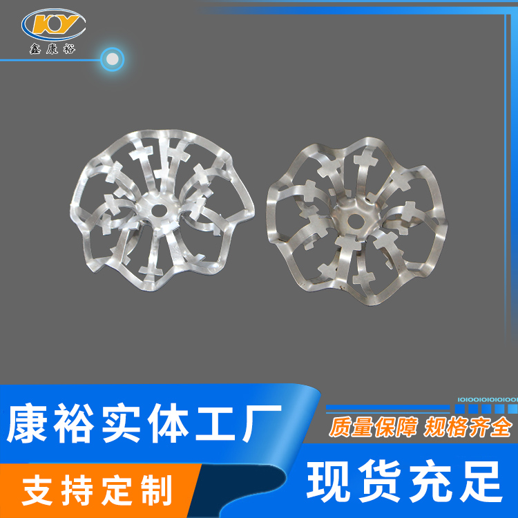 鋁花環(huán)填料主要材質為鋁合金,產品采用鋁合金板沖壓制成,外觀為橢球狀填料,包括有由一塊板材一體成型內環(huán)和外環(huán),該內環(huán)與外環(huán)之間連接有筋,所有筋是由上半圓環(huán)筋和下半圓環(huán)筋構成,每兩相鄰筋由上半圓環(huán)筋和下半圓環(huán)筋交錯排列。這樣具有比表面積大,單位重量輕。產品除具有一般的通量大、不易被堵塞、通量大、阻力小、壓降低等優(yōu)點外,還由于填料的空隙處能有較高的持液量,可使塔內液體的停留時間較長,從而增加了氣液兩相的接觸時間,提高了填料的傳質效率。