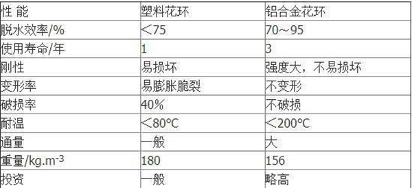 鋁花環(huán)填料主要應用于TRT發(fā)電機組中噴堿塔以及鋼鐵廠高爐煤氣清洗中的脫水器,也可用于化工廠中的填料塔中。在煤氣脫水器中使用后煤氣中的機械水脫除到7g/Nm3。在鋼鐵廠二文填料脫水器中,與所用塑料花環(huán)相比,金屬花環(huán)填料增加,不易膨脹脆裂。鋁合金金屬花環(huán)填料作為材質填料,在脫水性能、使用壽命等方面都比塑料花環(huán)明顯優(yōu)越(性能對比見表)。