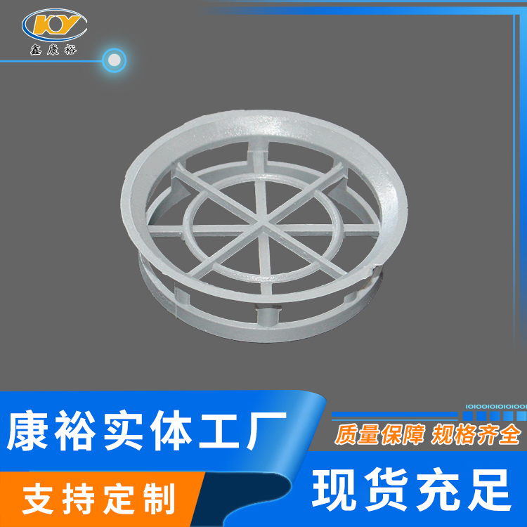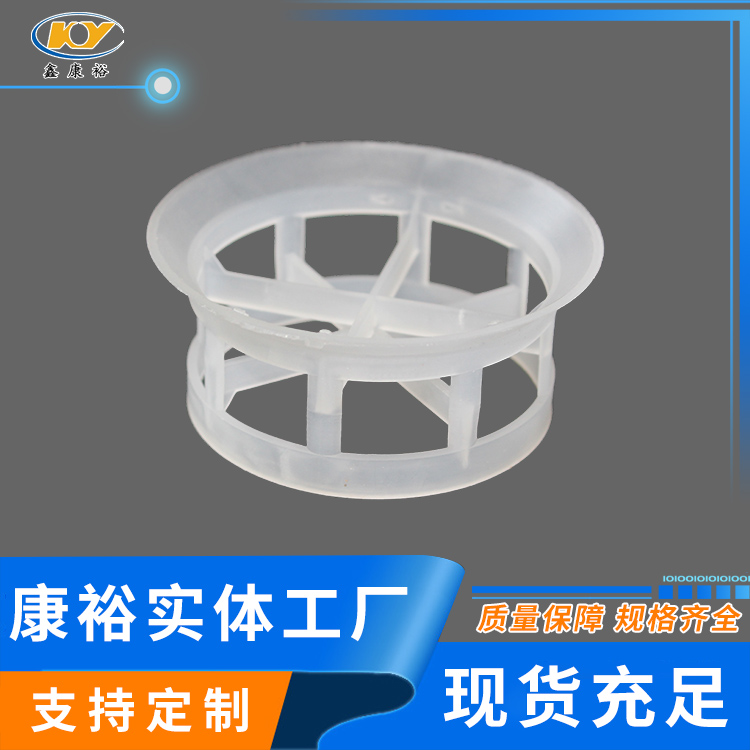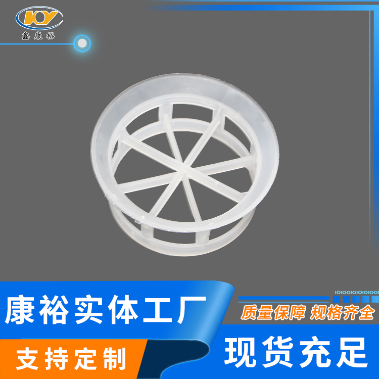 由于階梯環(huán)填料的側(cè)端增加了翻邊,不但可以增加填料環(huán)的機(jī)械強(qiáng)度,而且由于破壞了填料結(jié)構(gòu)的對(duì)稱性,因而增加了填料投放時(shí)的定向幾率。又由于翻邊的影響,使得填料在堆積時(shí)填料環(huán)隙之間的接觸由此線性接觸為主變?yōu)橐渣c(diǎn)接觸為主。這樣,不但增加了填料顆粒之間的空隙,減少了氣體穿過填料層的阻力,而且這些接觸點(diǎn)還可以為液體沿填料表面流動(dòng)的匯聚分散點(diǎn),從而加進(jìn)了液膜的表面更新,有利于填料傳質(zhì)效率的增強(qiáng)。