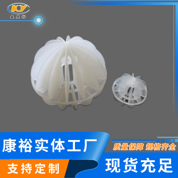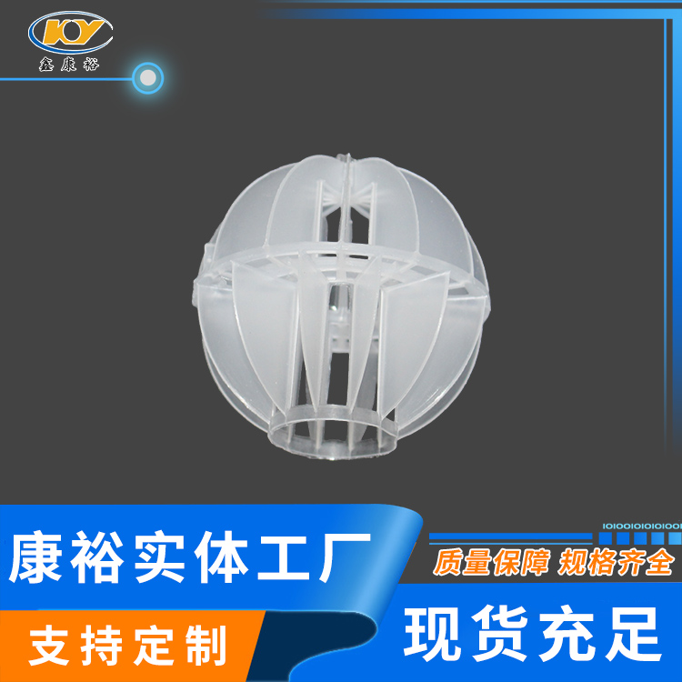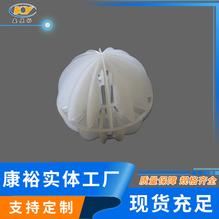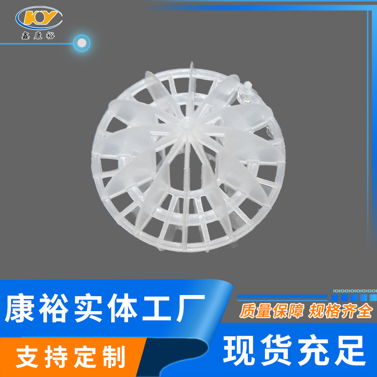 塑料多面空心球填料是水處理項目和廢氣處理常用到的一種填料,也是現(xiàn)在環(huán)保裝置項目常見的一種填料,大多采用聚丙烯(PP)塑料制成。多面空心球填料,在球中部沿整個周長有一道加固環(huán),環(huán)的上下各有十二片球瓣,上下球瓣互相交錯,沿中心軸呈放射形布置。多面空心球填料具有表面積大,傳質(zhì)效率高,產(chǎn)品的球瓣與球瓣之間空間大,且重量輕、強度大、安裝方便、葉片多,阻力小,耐高溫,耐腐蝕,性能穩(wěn)定,適用于中間水箱,二氧化碳脫氧塔,接觸反應(yīng)塔等裝置。在全國電力、化學、化纖、電子、造紙、化肥生產(chǎn)、河水淡化,環(huán)保、三廢處理等行業(yè)的水處理、脫碳、脫氣、凈化、脫碳酸及油水分離等處理裝置中廣泛使用。