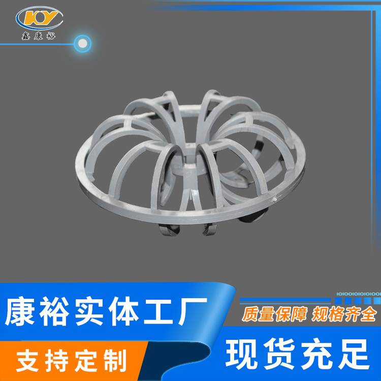 塑料花環(huán)填料早是由美國A.J.Teller于1954年研制開發(fā)出來的,故而常稱之為泰勒花環(huán)(TellerRosette)。由于填料的空隙處能有較高的持液量,可使塔內(nèi)液體的停留時間較長,從而增加了氣液兩相的接觸時間,提高了填料的傳質(zhì)效率。 花環(huán)填料也稱梅花環(huán)填料塑料花環(huán)填料是由12個小圓環(huán)按徑向排列而組成的一個大扁球體,很類似于一個螺旋形彈簧首尾相接繞成的一個圓球體。有的小圓呈A字;有的在小圓和大圓邊沿還帶有齒;有的外圍沒有大圓圈,只有里面的小圓組成等,客戶可根據(jù)各自的要求訂購不同種類的花環(huán)。